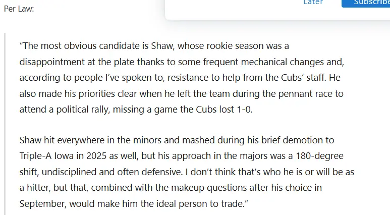 I guess we are going to do the Shaw thing again, but even the "excused absence" thing isn't it. https://www.chicitysports.com/chicago-cubs-matt-shaw-trade-alex-bregman-nico-hoerner -