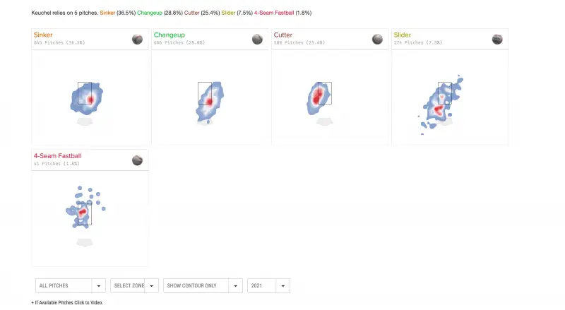 2021 Keuchel: 2020 Keuchel: The biggest difference I see is that his cutter is now terrible. He was mostly throwing it low and in to hitters last year. It's far more off the plate this year and up. High cutters get destroyed. And if it's too far inside, righties won't swing at it. He was in a good place with it last year, but now it's a meat pitch. It's so terrible that he throws it 5% less now. His cutter was his best pitch by run value last year at +10. It's now his second worst (next to the sinker) at -9. That's almost a 20 run difference in the span of a year. His slider is also far more inconsistent this year, which is a big reason why his number vs. lefties are terrible. It seems like he only throws his sinker and change up in almost one spot as well, which kind of goes back to the idea that he's been nibbling since he's afraid of those 2 pitches getting hit hard if they are anywhere near the middle of the plate (and they have been). I think the fact that he can't use his cutter anymore as a consistent out-pitch has decreased the effectiveness of his change up and sinker. His control on the cutter has been bad all year with the exception of a few starts. When he's had good cutter command, he's been able to post good starts vs. good offenses like Cincinnati, Tampa, and Toronto. When he hasn't had it...well you've seen how the last 3 starts went.2 points