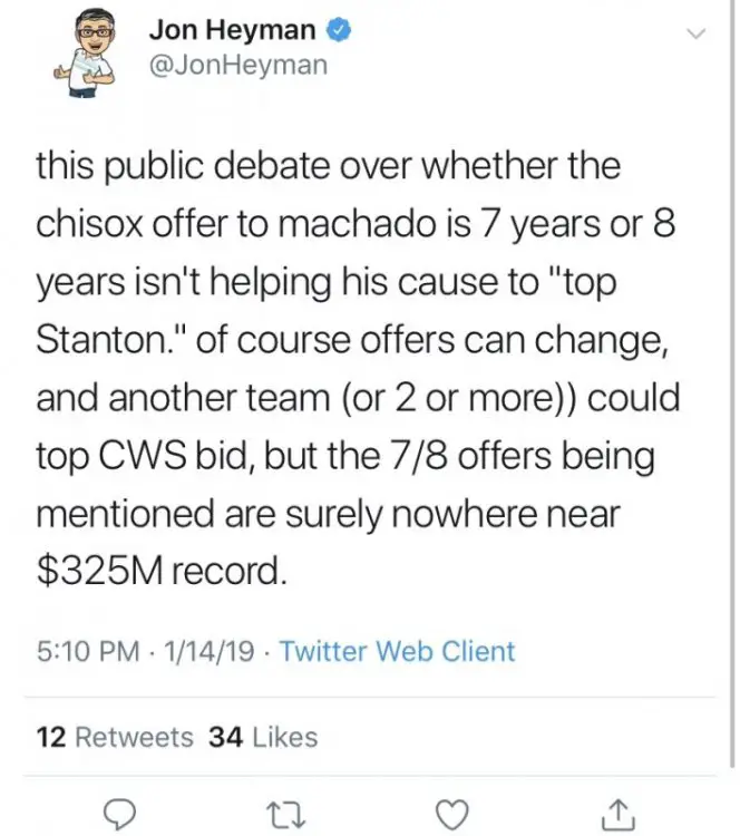 So this could mean a few things. 1. The White Sox offer is really the only official offer, so why not start low, and work up? 2. Agent leak to start the bidding process. 3. The White Sox want Machado, but like the Yankees, refuse to go over $200 million. -