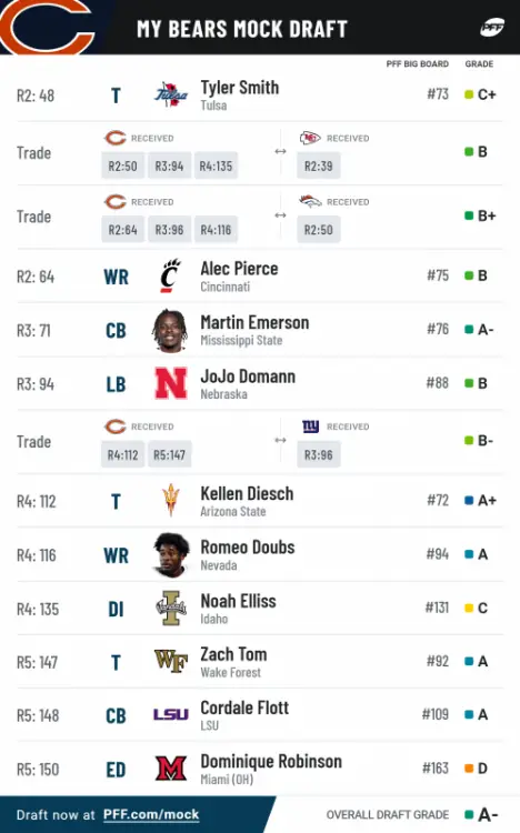 scs787 Posted March 24, 2022 Share Posted March 24, 2022 33 minutes ago, bmags said: Yeah I think they are at least at a point now where they have modest upgrades in the interior prior to the draft, but I can't imagine they go in to the season with Borom/Jenkins as the tackles. It may actually be hard to improve on Peters who was pretty damn good last year. But if they do sign Fisher who should at least be competent competition, that puts them in a good position for the draft to go after highest rated players in early rounds and not be forced into a guard or tackle at the end of a run of talent. Yeah, I'd be shocked if they didn't bring in Brown or Fisher, or maybe even bring back Peters. I think thats the order I'd want them to pursue too. Speaking of the draft, just did my first mock and I'd be pretty happy with this. 39. Devonte Wyatt DT- The WRs just didn't fall the way I would liked and instead of "Reaching" I decided to grab the 3 tech this team needs 55. Christian Watson WR- Traded down to pick up the 87th pick as well. Watson is a small school risk, and the past small school picks by the bears kinda scare me, but Watson is ridiculous. Big time size/speed guy. 71. Kyle Gordon CB- A freak corner with good movement, big fan of his. 87. Jeremy Ruckert TE- Former teammate of Fields. OSU didn't really utilize the TE all that much, so his upside doesn't really show up in the numbers. He is a more than willing blocker and a damn good one at that. Link to comment Share on other sites More sharing options...