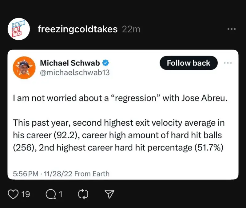 Falstaff Posted June 14, 2024 Share Posted June 14, 2024 27 minutes ago, Quin said: But in all seriousness: I've always had a soft spot for Jose for several reasons - the fact that the Sox signed "The Best Hitter You've Never Heard Of," the fact that he was a steady bat most of his career, he was always a good soldier, acting like role model for younger dudes, diffusing fights like when Karinchak hit him in the head, and because I got to interview him once and he came across as the most genuine dude - even despite my extremely limited Spanish (Minnie's eldest son worked with my dad, he was our translator). So it sucks to see how hard he's fallen off. I know retiring numbers is rarified air, but he was an MVP and he's all over the Sox record books despite coming over at an older age. For the traditional stats: 3rd in homers (behind Frank and Paulie), 5th in RBIs (Frank, Paulie, Appling, Baines) and 10th in runs. For advanced stats, he's 12 in fWAR - hurt by defense of course. Fourth in Offensive WAR behind Frank, Eddie Collins, and Minnie. I am right there with you , Jose will always be a fav. I remember a few years back Jose was in the dugout and the Sox had a long inning. Abreu had either Yermin or Yomer in a bear hug pinned against the dugout railing. It was hilarious , Abreu kept the bear hug on the whole 1/2 inning , lol Quote Link to comment Share on other sites More sharing options...