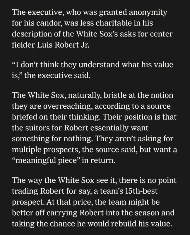 Chicago White Sox Posted December 5, 2024 Share Posted December 5, 2024 (edited) Jim Bowden proposal in The Athletic: White Sox Give: CF Luis Robert White Sox Get: 3B Cam Collier (20 years old | Y22 1st round pick | #5 org prospect) SS Tyson Lewis (18 years old | Y24 2nd round pick | #9 org prospect) RHP Luke Holman (21 years old | Y24 CB-B pick | #11 to #15 org prospect) I would accept that offer in a heartbeat. Edited December 5, 2024 by Chicago White Sox 1 Quote Link to comment Share on other sites More sharing options...