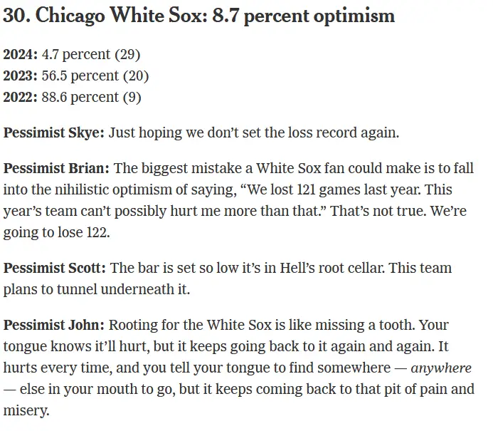 ptatc Posted March 13, 2025 Share Posted March 13, 2025 6 minutes ago, southsider2k5 said: https://www.nytimes.com/athletic/6186874/2025/03/11/mlb-fans-optimism-results-rankings/?campaign=12883820&source=athletic_top_stories_email&userId=6062851 Rightfully so. It's not going to be a good year for wins. Hopefully we see prospect progress. Quote Link to comment Share on other sites More sharing options...