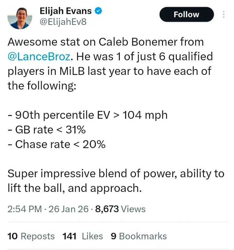 RudyLawRules Posted yesterday at 05:31 PM Share Posted yesterday at 05:31 PM (edited) Keith Law now has Caleb Bonemer up to 44 in his Top 100 prospect list and now the below. We may have gotten this one right!! Elijah Evans from @futuresox with some stats breakdown. https://x.com/i/status/2015891206606319718 Edited yesterday at 05:36 PM by RudyLawRules 3 Quote Link to comment Share on other sites More sharing options...